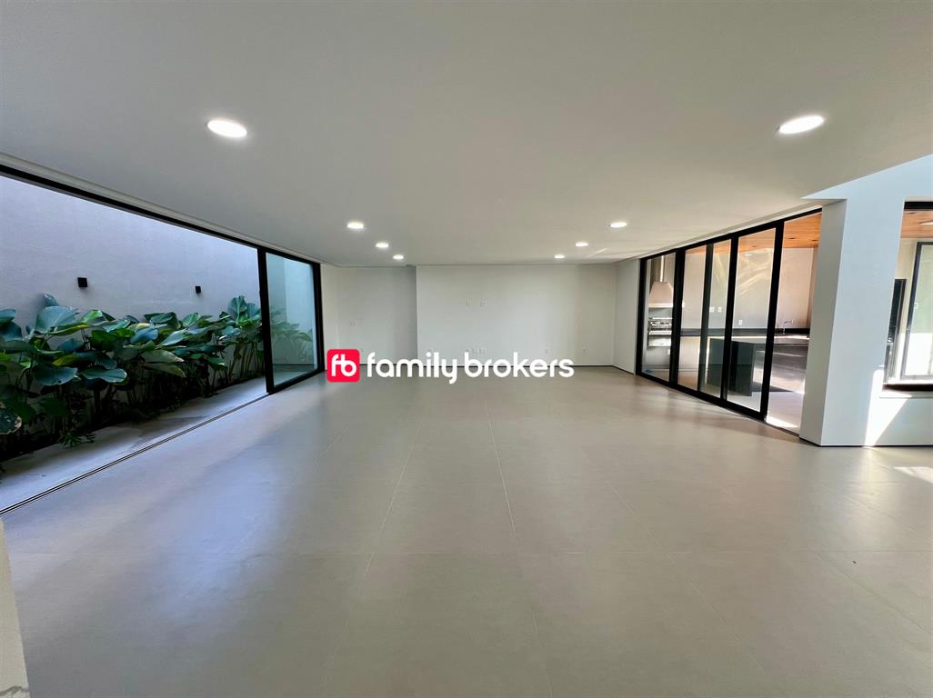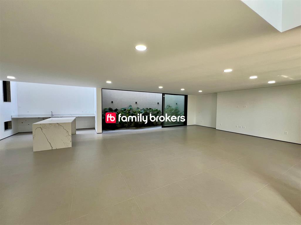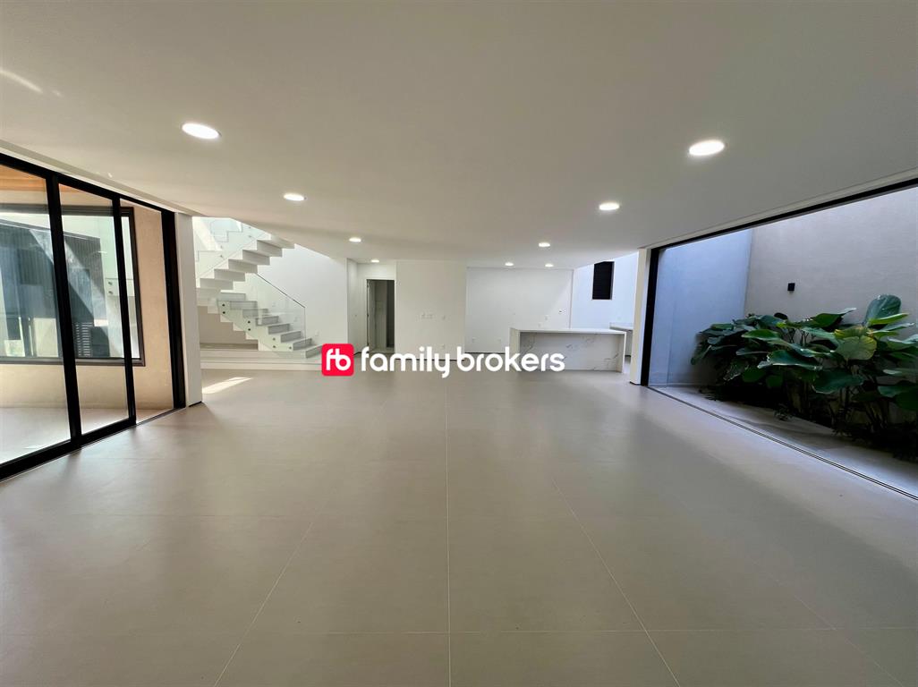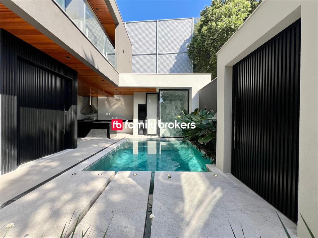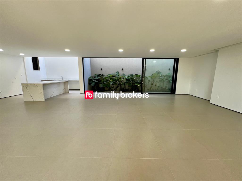 No primeiro pavimento, você encontrará garagem para até 4 carros, hall com pé-direito triplo, living integrado com previsão para adega, lavabo social e cozinha moderna com ilha central. Há ainda área de serviço, dependência completa, depósito e espaço gourmet com lavabo. Para completar, lazer com piscina, sauna a vapor, ducha e jardim.