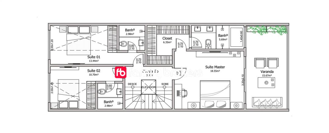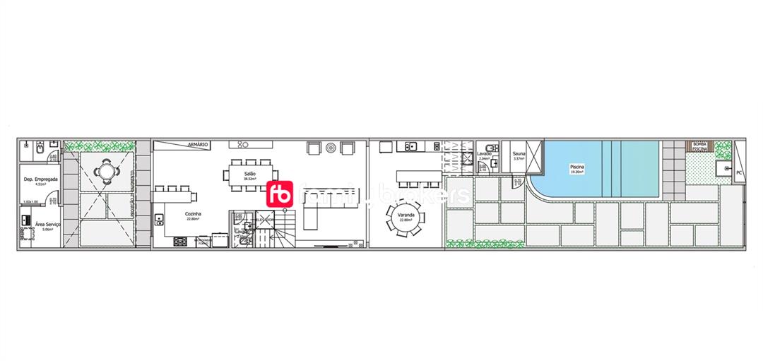 - 260 m² com 3 quartos e 6 banheiros.