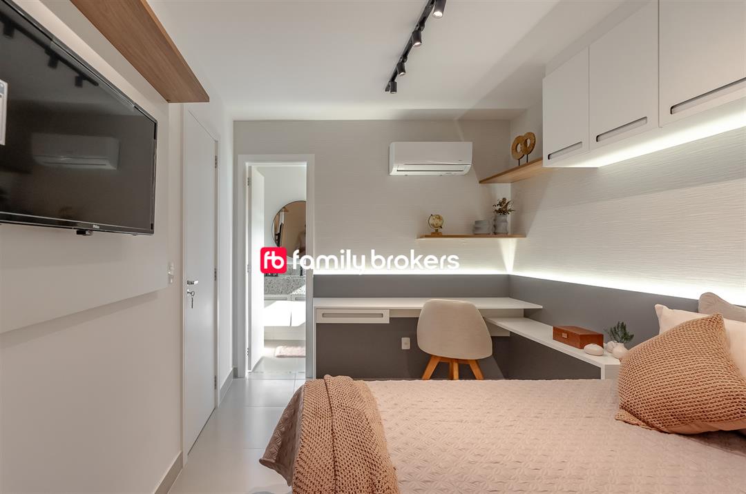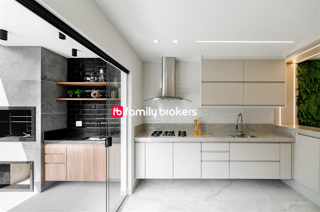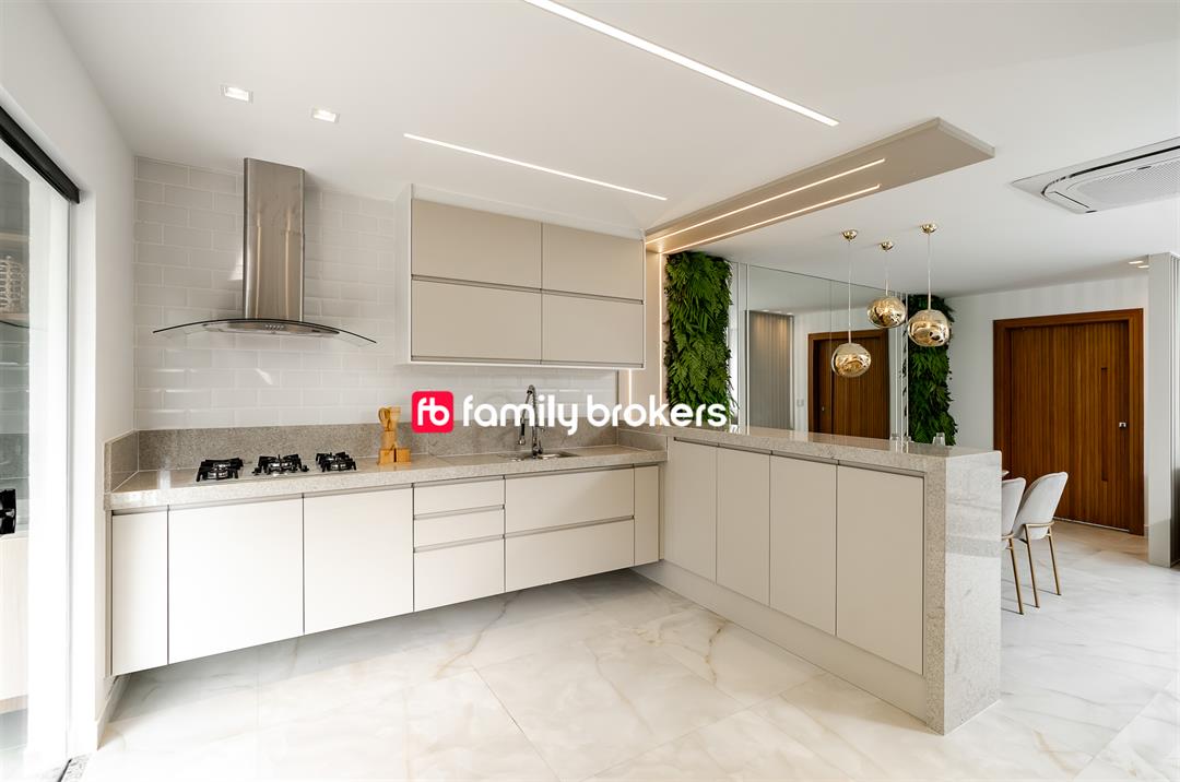 A cozinha americana é outro destaque, integrando-se perfeitamente à área social. Com design contemporâneo, ela facilita a interação enquanto se prepara as refeições. Os acabamentos de qualidade superior garantem durabilidade e estilo, tornando a cozinha o lugar ideal para criar memórias gastronômicas.